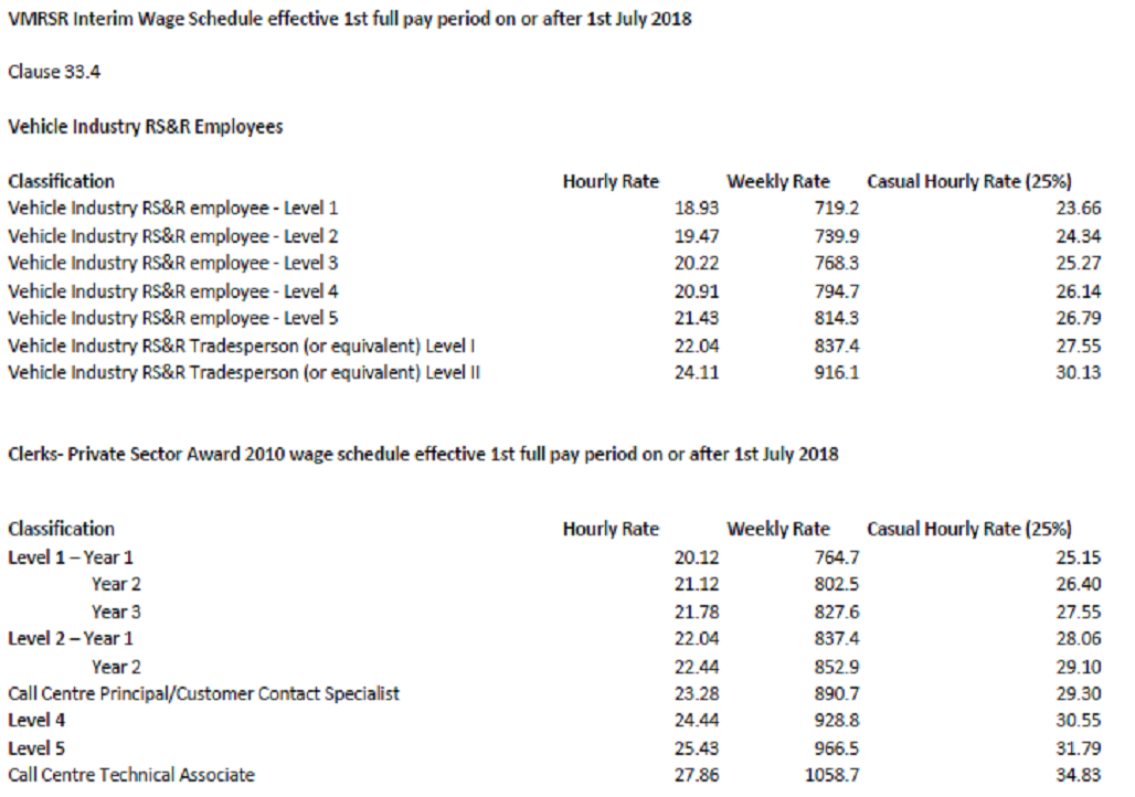 Members are referred to the ‘Interim’ wage rates below which reflect the increase in the adult wage rates in the Vehicle Award and Clerks Award, pending the finalisation of all award rates by the FWC. Complete revised wage schedules in both awards will be updated on the MTA website in due course. It is anticipated that the FWC will issue the finalised rates within the next two weeks.