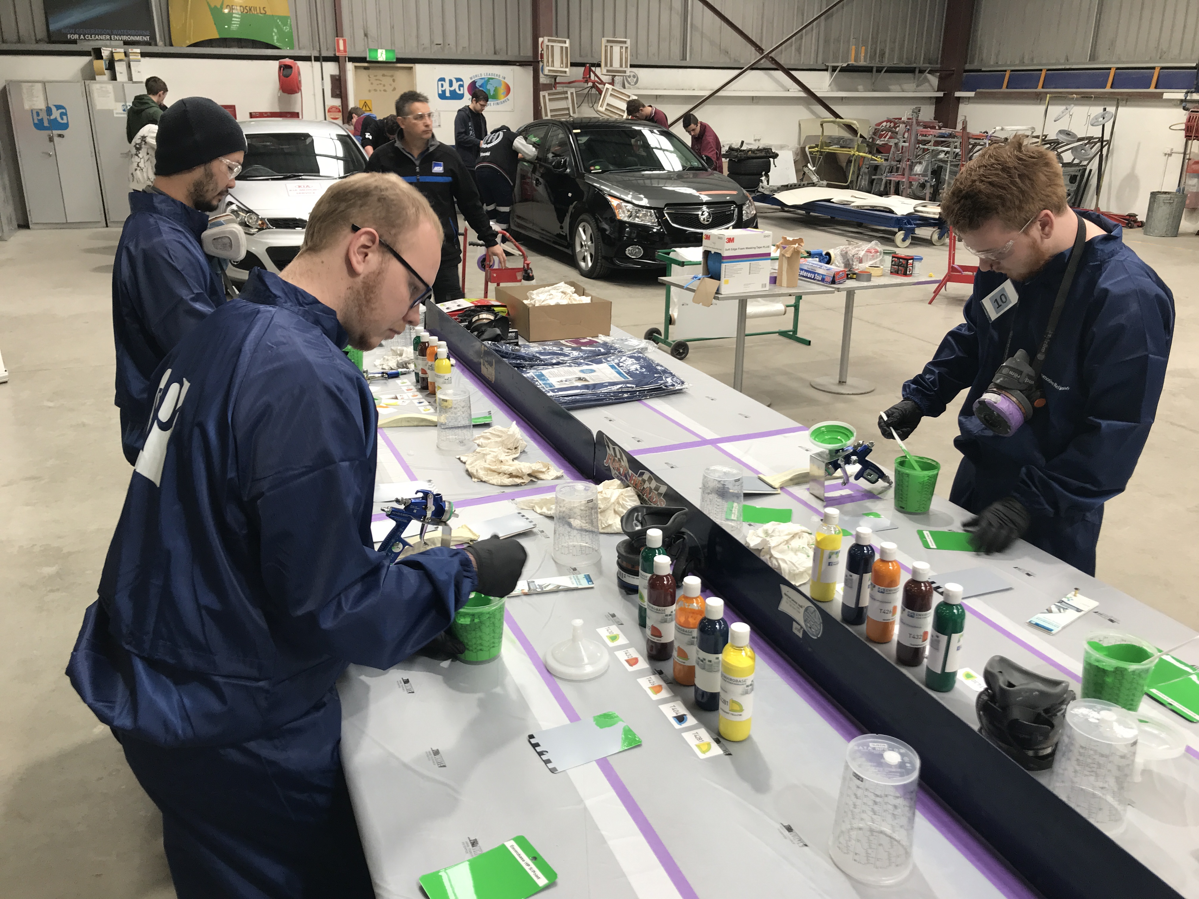 The PPG Colour Matching Competition has been running for over 20 years, giving vehicle painters an opportunity to demonstrate their knowledge of colour theory, colour matching and spray painting skills. Each contestant is provided with equipment and timed to match two colours, usually one solid and one metallic /pearl. Each contestant is judged on safety, cleanliness, work practices and importantly, how well they can match the colours.