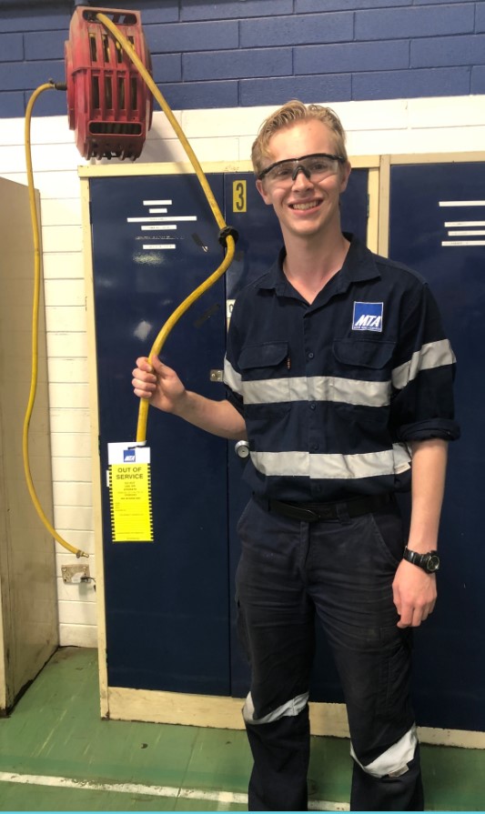 A MTA Light Vehicle Technician apprentice, Ben, recently identified a leaking airline hose before using a rattle gun in the MTA’s workshop. Serious injuries can occur from damages to compressed air equipment such as this and he promptly disconnected the airline from the mains, installed an “Out of Service” tag on the airline and reported the hazard immediately to the WHS&RTW Coordinator.