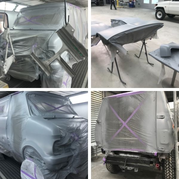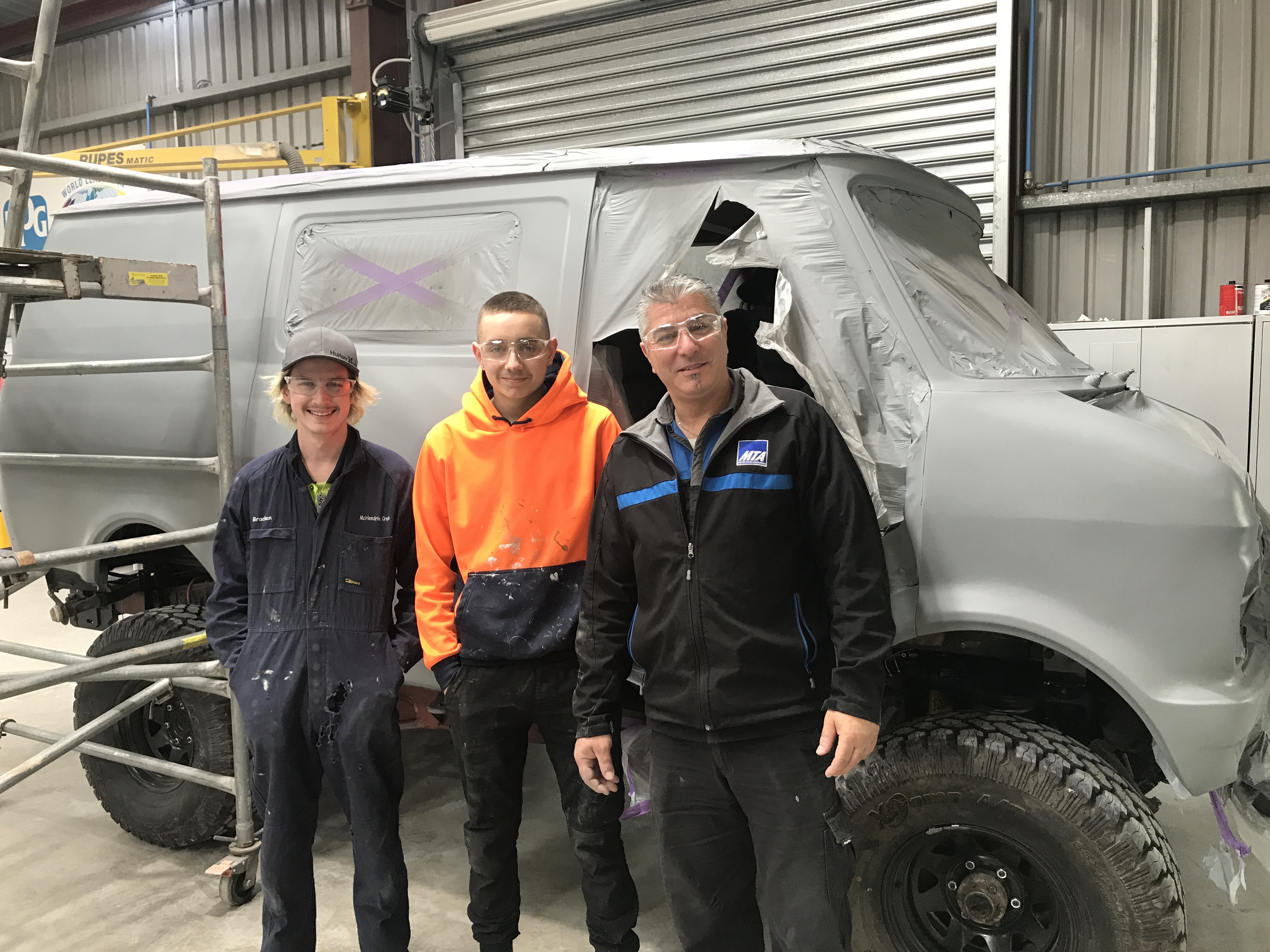 MTA trained Automotive Refinishing Technology apprentices Braden McHendrie and Trey Stamopoulos, along with Trainers Matt MacDonald and Rob Capelli, have prepped and primed a classic Bedford van, ready for painting.