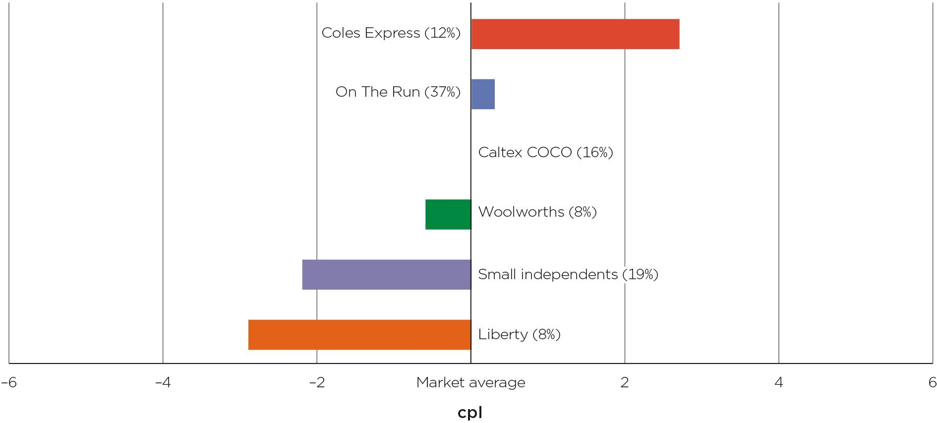 The graph below shows the difference between each major retailer’s annual average RULP price and the market annual average RULP price in Adelaide in 2017: