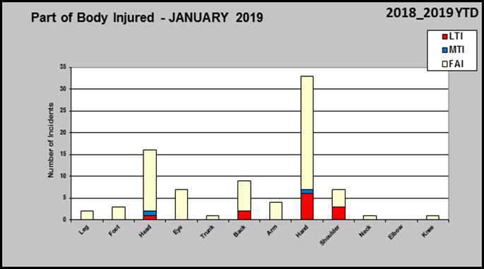 The below graph shows the main part of body injured for FY 2018/19 YTD. Hand, Back, Shoulder and Head are the body location causing the lost time injuries in the workplace.